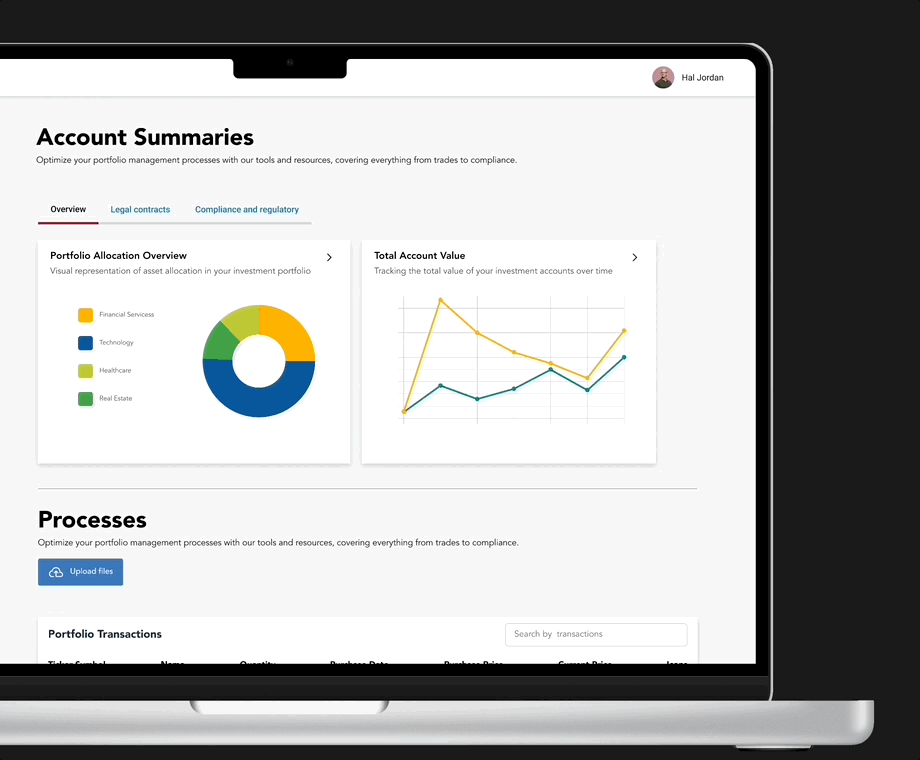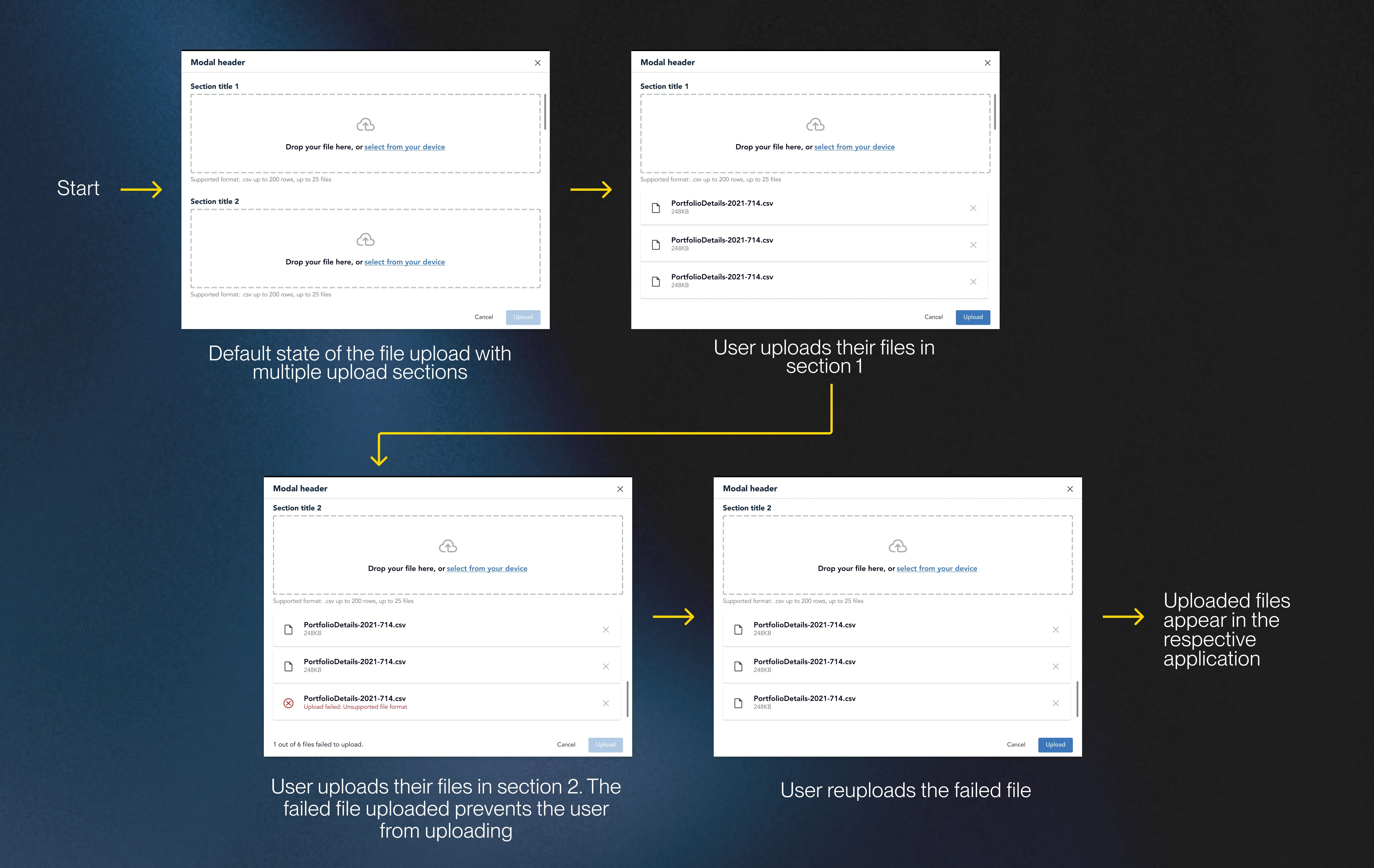 Putting all the pieces together, this is the redesigned file upload process for CGI! I made high-fi prototypes to demonstrate the flexibility of the components showing use cases for single and multi section file uploads.