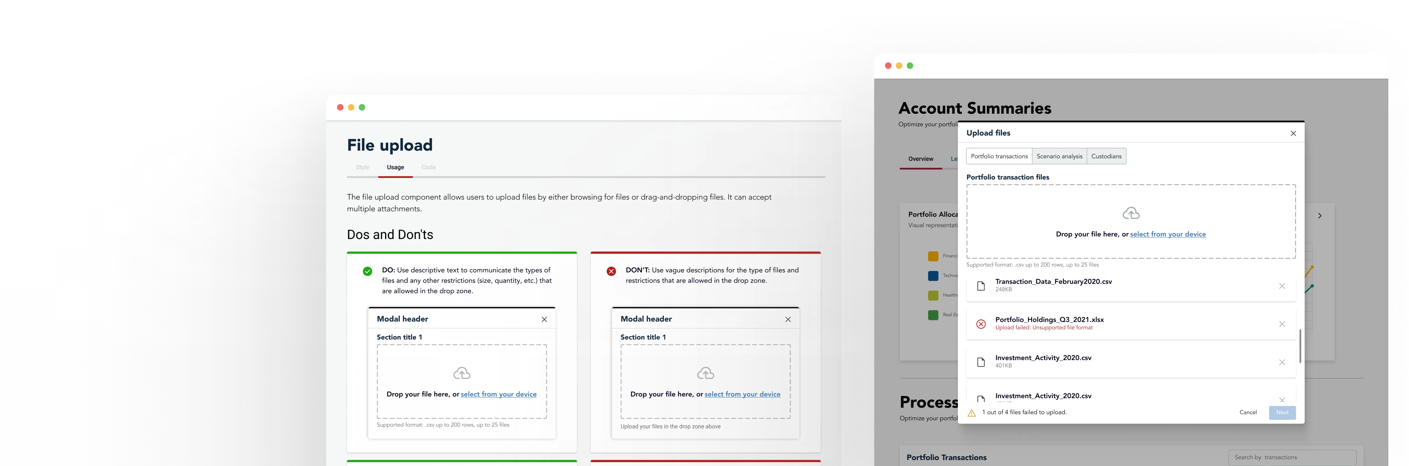 Recall that one of our main issues with the current design was that its implementation was inconsistent across our products. What was missing was a source of truth that designers, devs and PMs could refer to when implementing file uploads, So I developed a comprehensive usage and best practice guidelines to help our teams understand how to use the pattern even after my internship ended, I took inspiration from the usage documentation I discovered during phase 2 of the research.