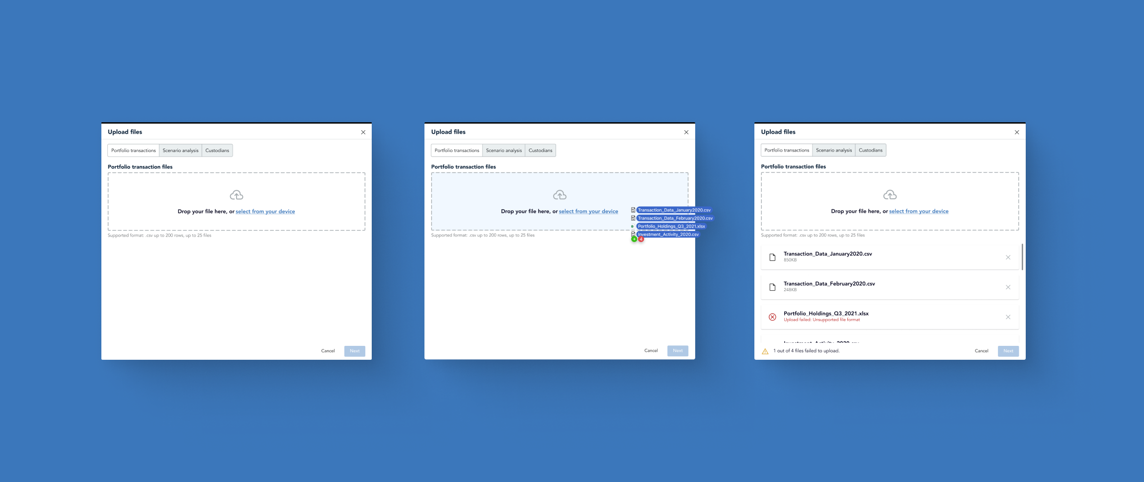 Instances of the file upload were not consistently implemented across CGI’s products, deviating from the specifications of the original design. Varied use of icons and layouts resulted in visual inconsistencies across platforms.